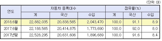 국산차는 2084만대(91.1%), 수입차는 204만대(8.9%)로 수입차 점유율 역시 꾸준히 증가(2017년 6월 8.0%→ 2018년 6월 8.9%)하는 것으로 나타났다.
