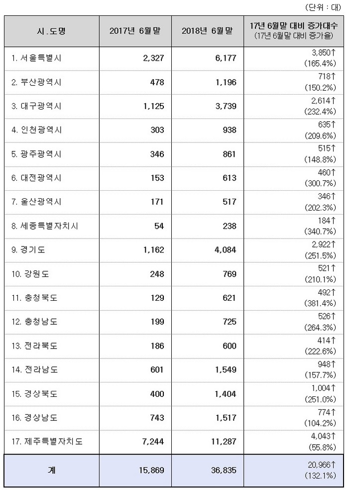 [로컬세계 남성업 기자]국토교통부(장관김현미)가 운영하고 있는 자동차관리정보시스템(VMIS)에 따르면 2018년 6월 말 현재 우리나라의 자동차 누적 등록 대수가 2017년 말에 비해 약 1.6% 증가한 2288만2035대로 집계되어 인구 2.3명당 자동차 1대를 보유하고 있는 것으로 나타났다.
