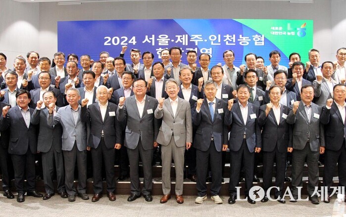 ▲강호동 농협중앙회장은 19일 농협중앙회 서울본부에서 서울·제주·인천농협 조합장, 중앙회 임직원 등 150여명이 참석한 가운데 지역본부 현장경영을 개최했다. 강호동 농협중앙회장이 참석 조합장들과 기념촬영을 하고 있다. |