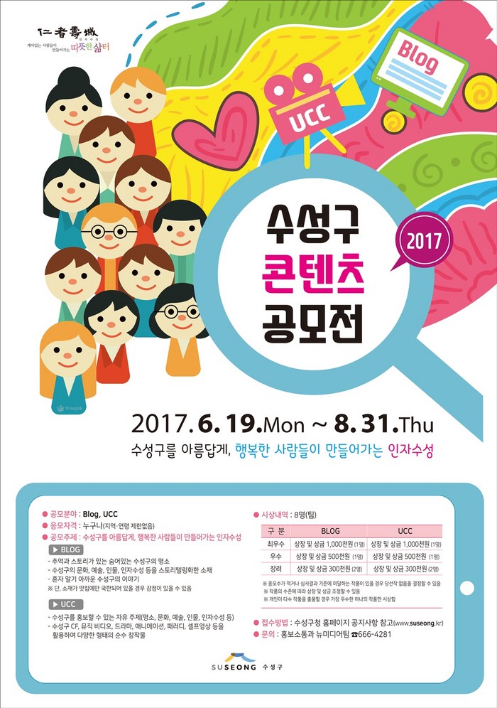 [로컬세계 박세환 기자]대구 수성구청장은 주민들의 독창적인 생각과 시선을 홍보에 적극 활용하기 위해 오는31일까지 2017 수성구 콘텐츠 공모전을 개최한다.