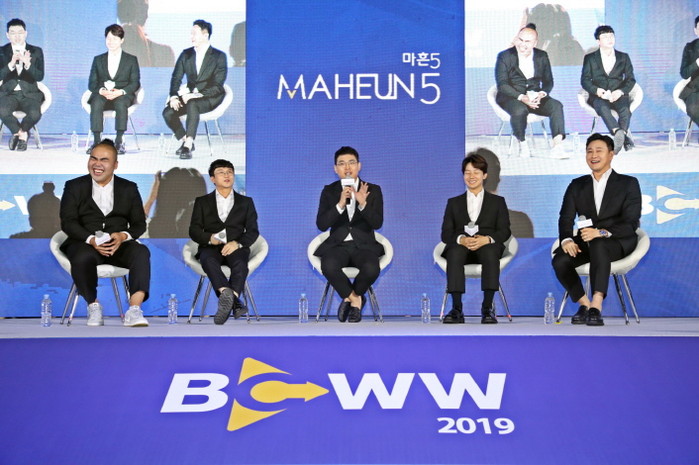 ▲23일 서울 강남구 코엑스 B홀 중앙무대에서 KBS 개그맨 22기생으로 구성된 프로젝트 밴드 '마흔파이브'의 라이브 톡이 진행되고 있다. (왼쪽부터 개그맨 김지호, 박성광, 박영진, 허경환, 김원효) |