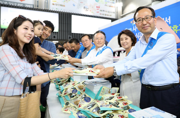 | ▲7일(금) SRT수서역 지하1층 맞이방에서 강준석 해양수산부 차관(사진 우측에서 첫번째)과 김임권 수협중앙회장(사진 우측에서 세번째)이 '여름휴가 어촌에서 보내기 캠페인'을 열고 시민들에게 수산물을 나눠주고 있다. |