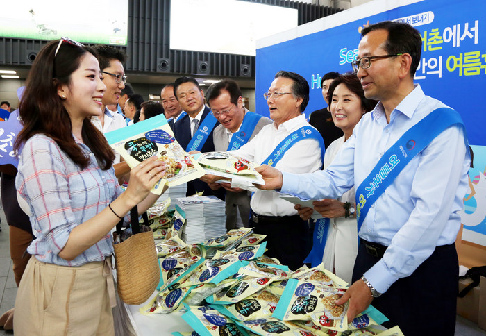 | ▲7일 SRT수서역 지하1층 맞이방에서 강준석 해양수산부 차관(사진 우측에서 첫번째)과 김임권 수협중앙회장(사진 우측에서 세번째)이 '여름휴가 어촌에서 보내기 캠페인'을 열고 시민들에게 수산물을 나눠주고 있다. |