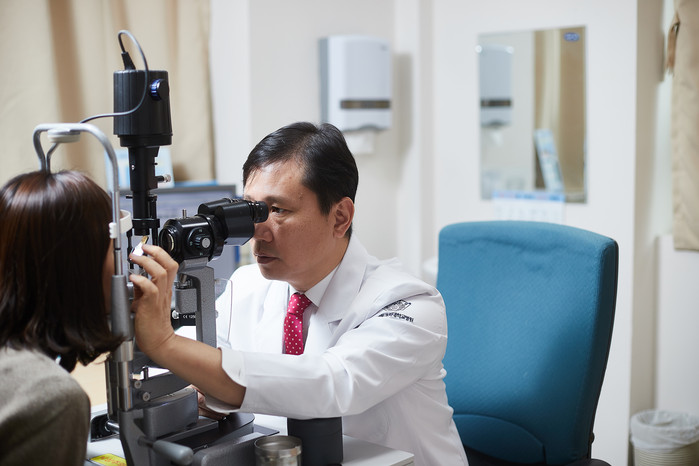 ▲진료 중인 강동경희대학교병원 안과 강자헌 교수 |