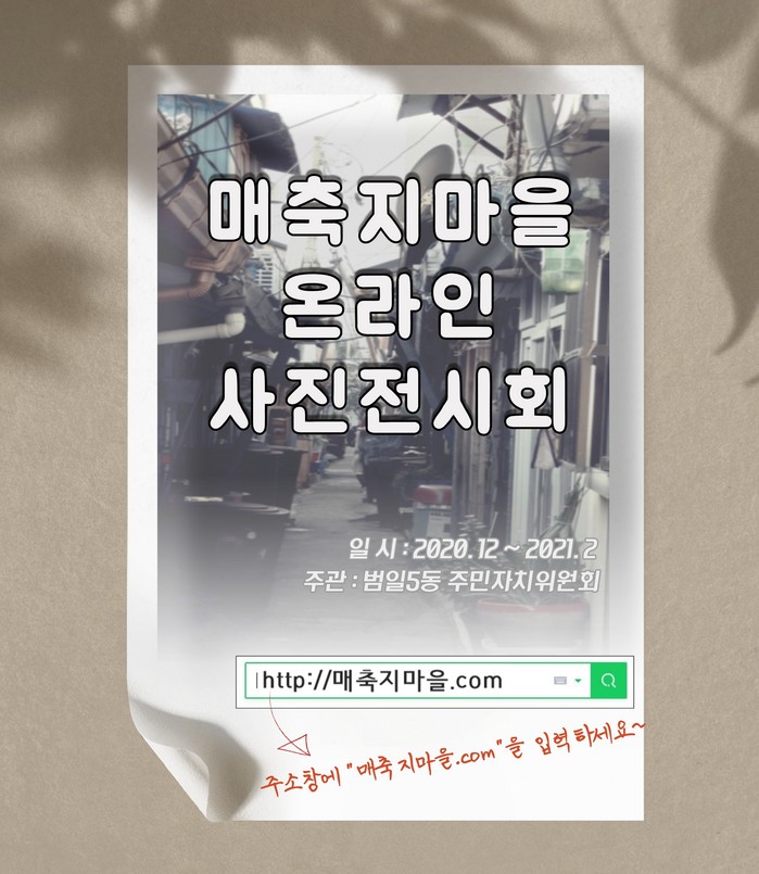 [로컬세계 맹화찬 기자]부산 동구 범일5동 주민자치위원회는 매축지마을 온라인 사진전시회를 15일부터 3개월간 개최한다고 밝혔다.