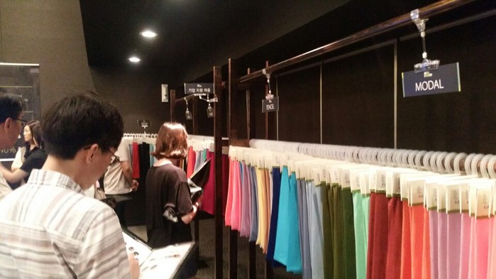 | ▲ ‘2015 G-KNIT 그린신소재 발표회’에서 섬유관계자들이 그린 신소재 기술로 만들어진 상품을 살펴보고 있다. |