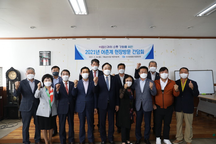 | ▲임준택 수협중앙회장(사진 중앙)과 윤재갑 국회의원(사진 우측에서 네번째)이 24일 해남군수협 어란어촌계에서 열린 어업인 간담회에 참석했다. |