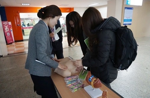 ▲지난 3월 29일 충남대학교에서 여학생들이 유방암 자가 체험을 하고 있다. |