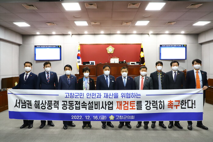 이와 관련 고창군의회는 결의안을 통해 ▲해상풍력 발전량이 부안군 80%에 비해 고창군은 20%로 고창군 경유하는 송전선로 설치 절대 반대 ▲군민의 반대로 중단된 154KV 서고창~고창 송전선로 사업 재추진은 고창군의회와 고창군을 무시하는 처사로 지역민의 동의를 구할 것, ▲서남권 해상풍력 공동접속설비사업을 당초 계획대로 추진할 것 등을 촉구했다.