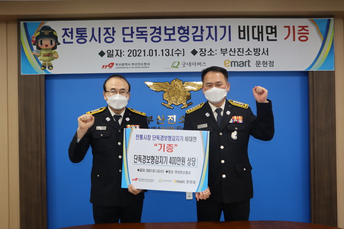 [로컬세계 맹화찬 기자]부산진소방서(서장 최대붕)는 13일 오후 본서 대회의실에서 이마트 문현점(점장 배기락)과 함께 단독경보형 감지기 기증 행사를 가졌다고 밝혔다.