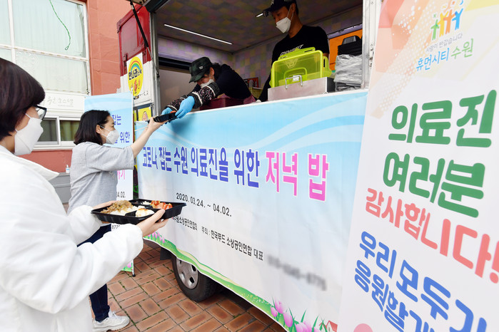 정인성 수원시푸드트럭소상공인연합회 이사장은 “수원시 공직자들과 의료진들이 코로나19를 극복하기 위한 노력을 보고 시민의 한 사람으로서 동참하기 위해 의견을 모았다”며 “맛있는 것 드시고 힘을 내셨으면 좋겠다”고 말했다.