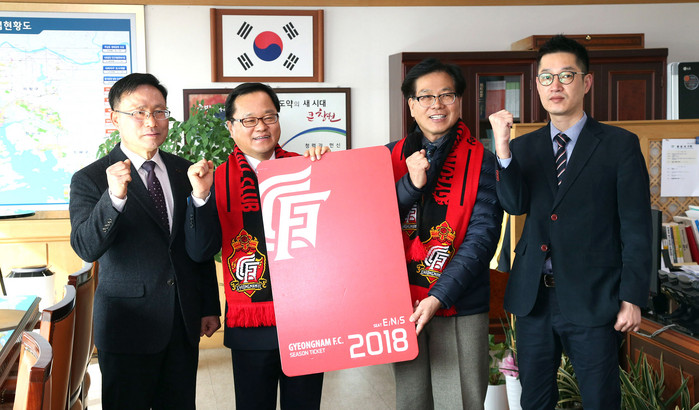 창원시 정구창 제1부시장은 19일 시청 집무실에서 조기호 경남FC 대표이사를 만나 2018 프로축구 홈 관중 증가와 도민화합을 위해 아낌없는 지원을 약속하고 경남FC 홈시즌권을 구입했다.