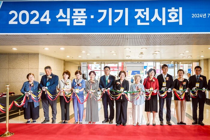 ▲2024 식품·기기 전시회 개막식 기념사진. 한국농수산식품유통공사 김춘진 사장(좌측 6번째) |