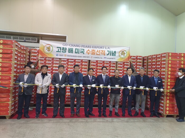 [로컬세계=김경락 기자] 전국 최고의 당도를 자랑하는 고창배가 미국 수출 길에 올랐다. 고창군은 고창배영농조합법인(대표 신점식)이 21일 고창군 농산물유통센터에서 대미수출을 위한 컨테이너 선적작업을 실시하고 수출기념식을 가졌다고 밝혔다.