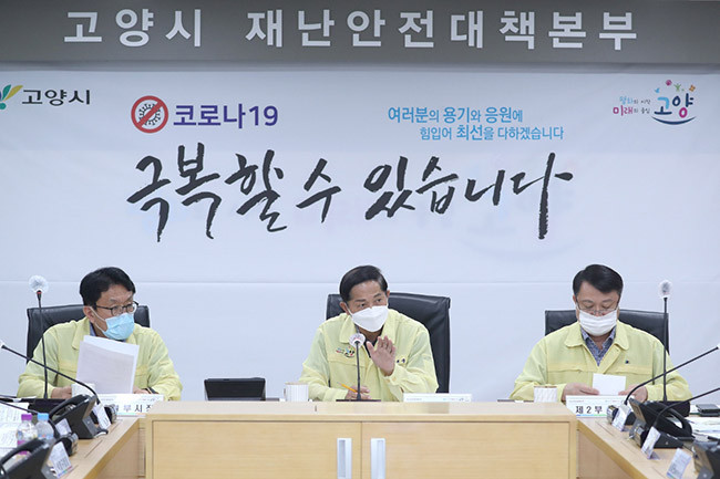 [로컬세계 강영한 기자]경기 이재준 고양시장은 23일 오전8시 30분 고양시 재난상황실에서 긴급 재난대책본부 회의를 주재하고 대중교통 비말차단용 투명비닐막 설치를 비롯 생활 속 코로나19 예방대책과 일반·휴게음식점 업주들의 적극적인 동참을 당부했다.