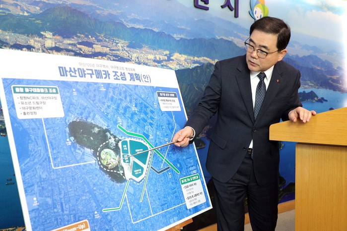 허성무 시장은 24일 시청 프레스센터에서 종합야구테마파크 조성을 포함한 마산야구메카 계획을 발표했다. 야구메카조성은 마산야구센터를 중심으로 종합야구테마파크 조성, 야구장 상권 신바람, 야구장 가는길 브랜드화, 야구붐업 등 4개 전략으로 조성하며, 755억원의 사업비가 투입된다.