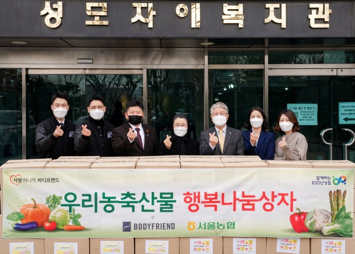 서울농협과 바디프랜드는 지난 17일 '사회공헌 실천을 위한 업무협약(MOU)'을 체결하고, 정기적으로 일정 금액을 공동 출연해 우리농축산물, 생필품 등으로 구성한 ‘우리 농축산물 행복나눔상자’를 사회취약계층에 전달하기로 했다.