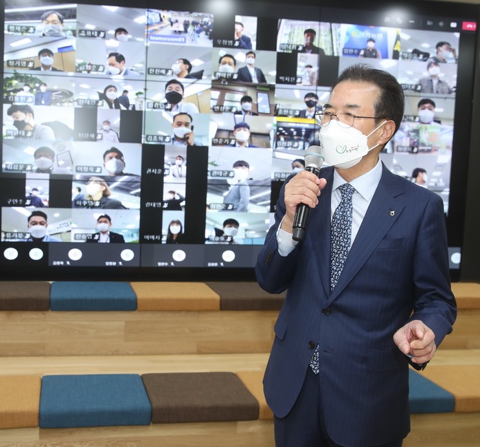 | ▲이성희 농협중앙회장이 4월 8일 서울 중구 농협중앙회 본관에 신설된 'NH스마트워크센터' 오프닝 행사에 참석해 지역본부 등 원격지 임직원들과 화상으로 소통하고 있다. |