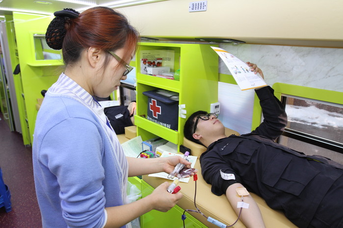 ▲군산해양경비안전서 소속 의무경찰이 헌혈을 하고 있다. ©로컬세계 |