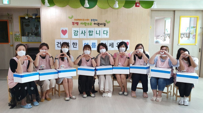 | ▲부영그룹이 말복을 맞아 임직원 9300여 명에게 삼계탕 선물을 지급했다. 부영그룹이 관리하는 '부영 사랑으로 어린이집' 교사들에게도 역시 삼계탕 선물이 전달되었다. 더레이크시티 부영 3단지 사랑으로 부영 어린이집 교사들이 부영그룹에서 말복 선물로 받은 삼계탕을 들고 있다. [부영그룹 제공] |