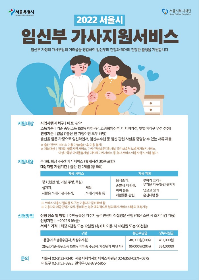 ‘2022년 서울시 지역사회서비스투자사업 시범사업’ 시행자치구로 선정돼 진행되는 이번 사업은 임신으로 가사활동이 어려운 임신부 가정의 가사부담을 경감하고, 임신부와 태아의 건강한 출생을 지원하고자 기획됐다.