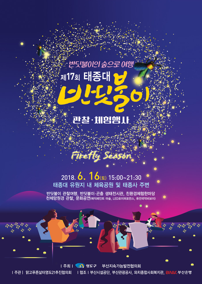[로컬세 계맹화찬 기자]국가 지질공원이자 명승지인 태종대에서 초여름 반딧불이의 향연을 즐길 수 있는 ‘제17회 태종대반딧불이 관찰체험행사’가 오는 16일 태종대 체육공원 및 태종사 일원에서 열린다.