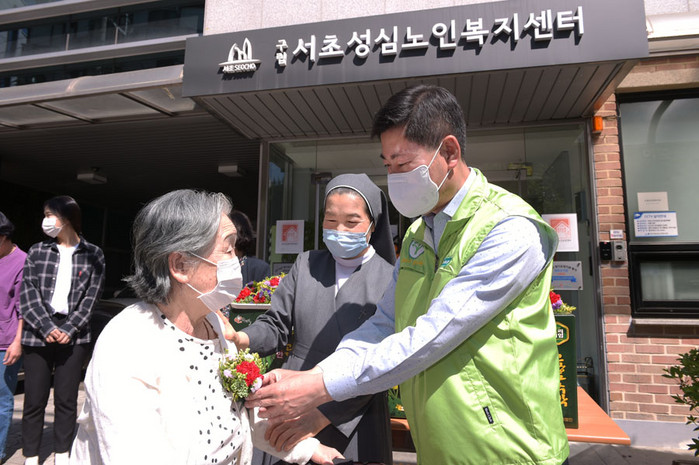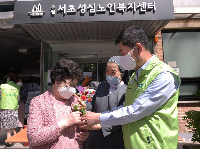 이날 농협유통 임직원 10여 명이 어버이날을 맞아 서초구립 성심노인복지회관에 방문해 요양 어르신 및 치매 어르신들께 과일 선물과 카네이션을 달아드리는 시간을 가졌다.(사진=농협유통 제공)