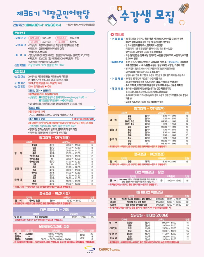 자세한 사항은 기장군 평생학습 홈페이지를 참고하거나 기장군민대학(709-3928, 5067) 및 기장군민어학당(709-3927, 5073)으로 문의하면 된다.