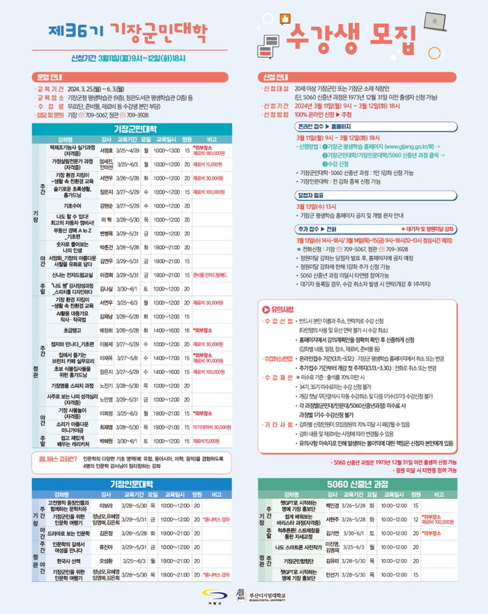 단, 기장군민대학 5060 신중년 과정은 1973년 12월 31일 이전 출생자일 경우 신청할 수 있다.