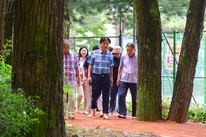 최문순 군수(가운데)를 비롯한 실과 소장들은 16일 화천읍 붕어섬에 조성된 황톳길 코스에서 현장 점검을 진행했다.(사진=화천군 제공)