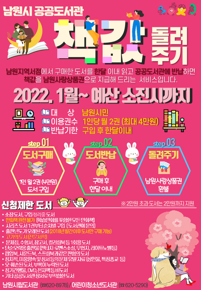 ‘책값 돌려주기’ 사업은 시민들이 남원 지역서점에서 책을 구입해 읽고, 한 달 이내에 공공도서관(시립·어린이청소년)으로 구입한 책과 도서 구입을 증빙할 수 있는 영수증을 가져오면 월2권 최대 4만원까지 남원사랑상품권으로 전액 지원하는 사업이다.