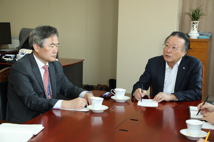 | ▲15일 김임권 수협회장(오른쪽)이 노량진수산시장을 방문해 정상화 현황을 점검하며 차질없는 정상화 추진 의지를 피력했다.(수협 제공) |