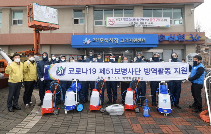 경기 오산시와 오산시자율방재단, 51사단 등은 10일 오색시장 일원에서코로나19 지역확산을 막기 위해 민·관·군이 합동해 시 전역에 전방위 방역을 실시하며 총력 대응에 나섰다.