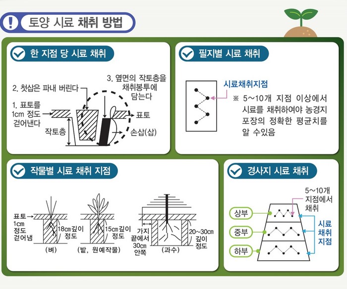 검정받을 토양은 수확 직후 또는 밑거름을 시비하기 1달 전, 모종삽 등을 이용해 표토 1~2cm를 걷어내고 첫 삽은 파내 버린 후 노출 옆면의 작토층을 깊이 15cm(밭 기준)까지 고르게 채취하면 된다.