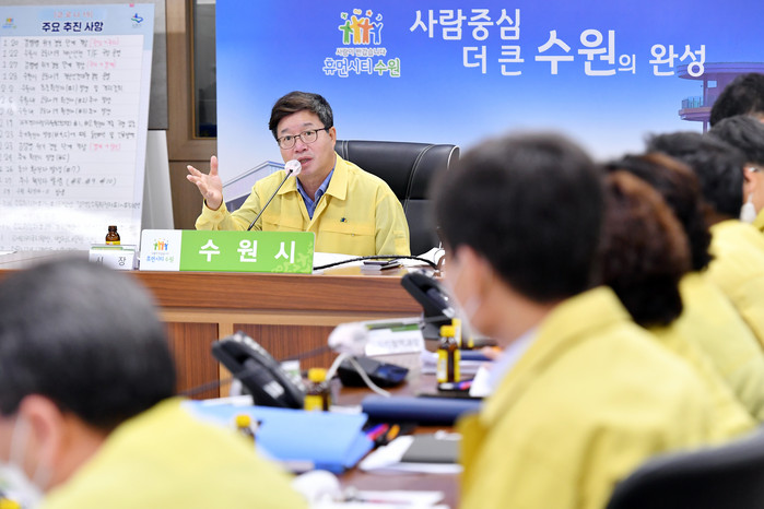 | ▲염태영 시장이 코로나19 상황보고회의에서 발언하고 있다.(수원시 제공) |
