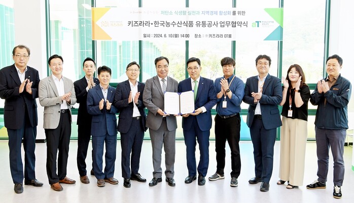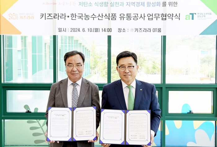 한국농수산식품유통공사와 ㈜키즈라라는 10일 전남 화순 소재 어린이 테마파크 키즈라라에서 저탄소 식생활 확산 및 지역경제 활성화를 위한 업무협약을 체결했다.