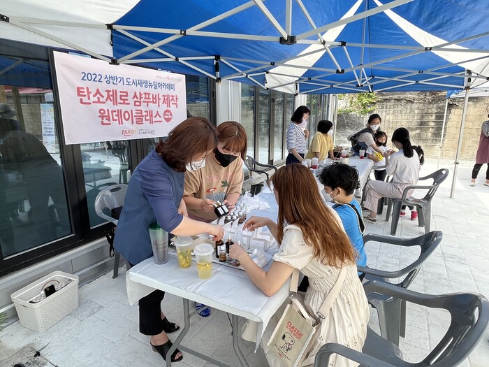 이번행사는 수료생들이 교육받은 내용을 주민들과 나누는 장으로 교육과목 중 숲정이마을 정원사 양성, 마을아카이빙&예술체험, 디자인비누 공방창업교육에서 진행됐다. 행사 내용은 ▲업사이클링 모종 나눔&허브 모히또 만들기 체험 ▲도자기 판접시 제작 체험 ▲탄소제로 샴푸바제작 원데이클래스 ▲사회적 경제조직과 함께하는 카페 음료 체험, 동충동 주민어울림 공간 사랑나눔어울림센터 체험할 수 있는 ▲구석구석 보물찾기 등으로 진행됐다.