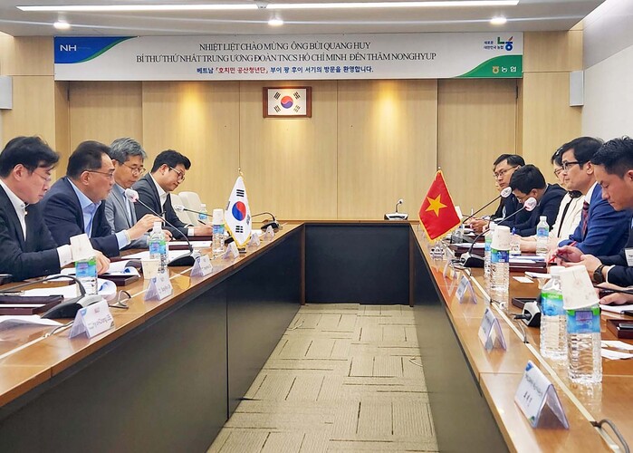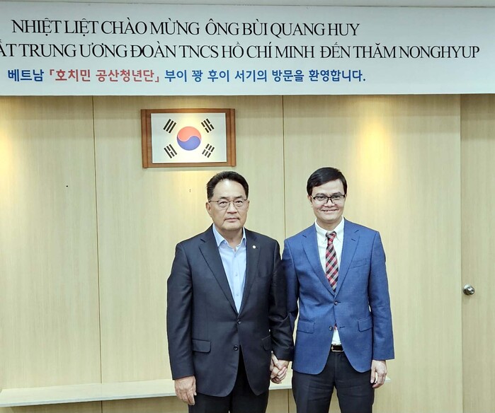 ▲농협중앙회 지준섭 부회장은 30일 서울시 중구 농협중앙회 본관에서 ‘부이 꽝 후이’ 호치민 공산청년단 제1서기를 접견하고 양국 청년농업인 육성방안과 농업분야 상호발전 방향에 대해 논의하였다. (좌)농협중앙회 부회장 지준섭 (우)호치민 공산청년단 제1서기 부이 꽝 후이. 농협 제공 |