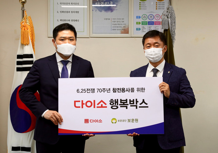 균일가 생활용품점 ㈜아성다이소(대표 박정부)는 6.25 전쟁 70주년과 6월 호국보훈의 달을 기념해 한국보훈복지공단 산하 보훈원과 보훈복지타운에 행복박스 500여 개와 공기정화 화분을 25일 전달했다.