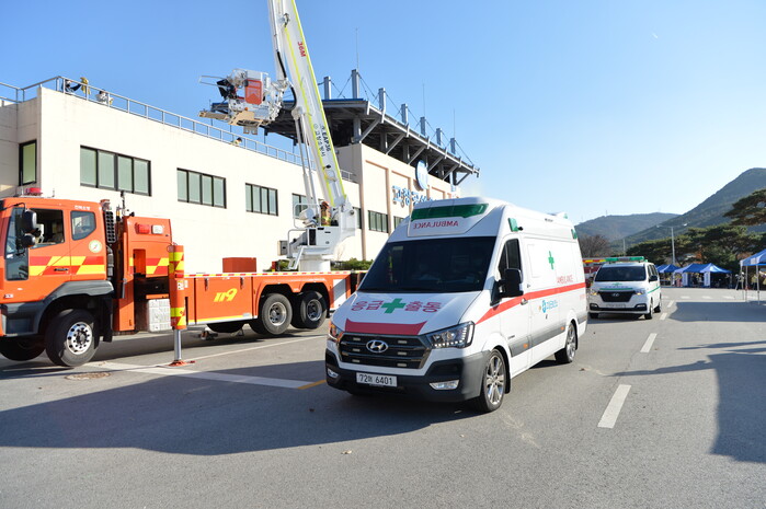 오후에 진행된 현장훈련은 고창군 지진발생 이후 고창읍 공설운동장이 붕괴, 건물 붕괴가 화재로 이어지는 상황을 가정해 화재발생과 초기대응, 비상대응, 재난수습 및 복구대응 등의 4단계로 진행됐다.