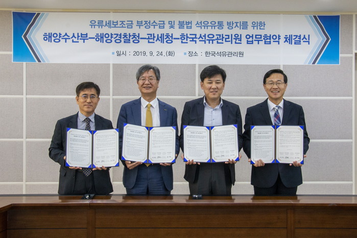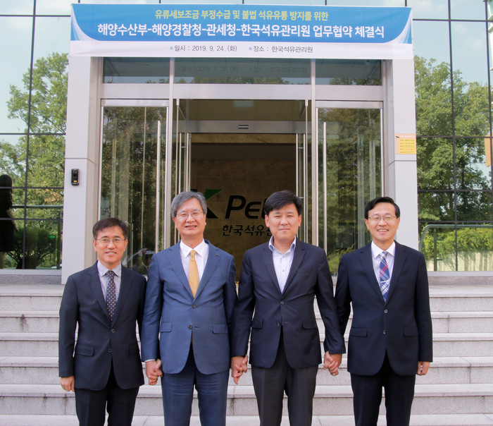 | ▲24일 오후 한국석유관리원에서 해양경찰청, 해양수산부, 관세청, 한국석유관리원 관계자들이 '유류세보조금 부정수급 및 불법 석유유통 방지를 위한 협업체계 구축 업무협약'을 체결한 뒤 기념촬영을 하고 있다.(관세청 제공) |