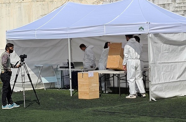 ▲지난 5일 오후 감만1구역재개발조합 진행요원들이 옛 부산외대 운동장에서 방역복을 입은 채 정기총회를 준비하고 있다. |