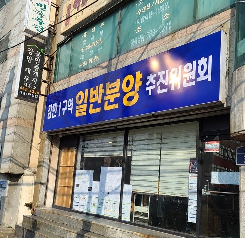 ▲부산 남구 감만1동 동항초등학교 인근에 위치한 감만1구역일반분양추진위원회(비대위) 사무실 전경. 출입문이 잠겨 있는 경우가 잦다. |