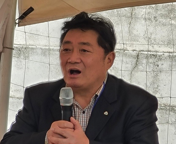 ▲지난 5일 오후 부산 남구 옛 부산외대 운동장에서 개최된 감만1구역재개발조합 2021년도 정기총회에서 김경래 조합장이 인사말을 하고 있다. |