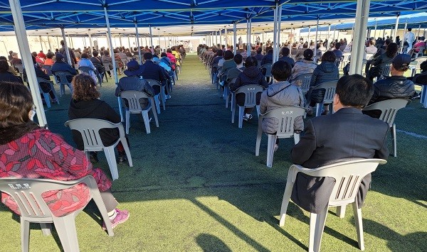 ▲지난 5일 오후 2시 부산시 남구 우암동 옛 부산외국어대 대운동장에서 감만1구역주택재개발정비사업조합 2021 년도 정기총회가 열리고 있다. |