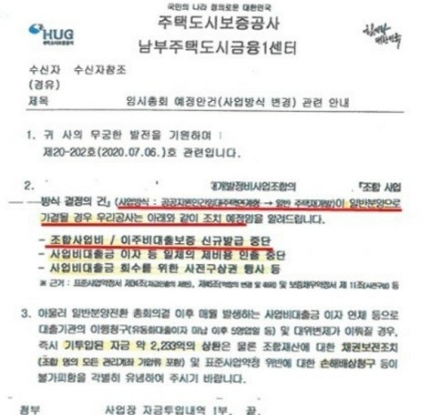 | ▲주택도시보증공사(HUG)가 지난해 7월 부산 남구 관내 모 재개발조합에 보낸 공문. “사업방식이 뉴스테이(공공지원민간임대주택연계형)→일반주택재개발(일반분양 방식) 분양방식으로 가결될 경우 조합사업비와 이주비대출보증 신규발급을 중단한다”라는 통보가 담겨 있다. 이 조합은 이런 허그의 통보를 무시하고 총회를 통해 일반분양 방식으로 전환했다가, 허그가 대출보증을 철회하면서 ‘보증사고’가 발생해 현재 8개월째 모든 사업이 올스톱된 상태다. |