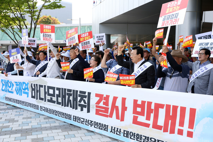 24일 충남 어업인과 관내 8개 수협 조합원 및 태안‧서산환경운동연합 등 환경 시민단체는 충남도청 문예회관 앞에서 7월말로 예정된 충청남도 태안 바다모래채취 예정지 지정고시 및 바다모래채취를 반대하는 성명서를 발표하고 기자회견을 열었다고 밝혔다.