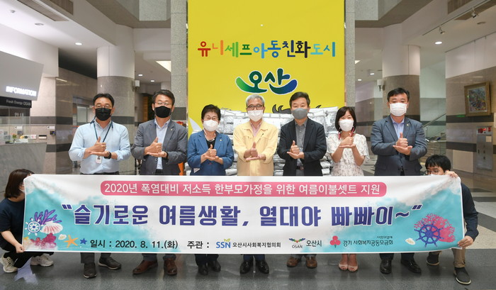 [로컬세계 고용주 기자]경기 오산시는 11일 시청 시장 집무실에서 오산시사회복지협의회(회장 김종훈)와 저소득 한부모가정 여름이불세트(2200만원 상당) 및 다중이용 사회복지시설 스마트 발열 체크기(4850만원 상당) 전달식을 가졌다.