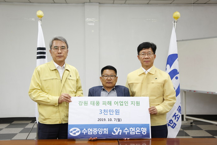 수협중앙회 홍진근 대표이사와 수협은행 권재철 수석부행장은 7일 삼척수협에 3000만원 원덕수협에 2000만원을 각각 기탁하며 태풍 피해를 입은 관내 조합원들의 재해복구를 지원했다.