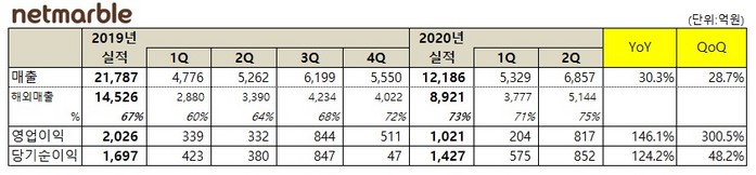 | ▲ 넷마블의 2020년 2분기 실적표 |